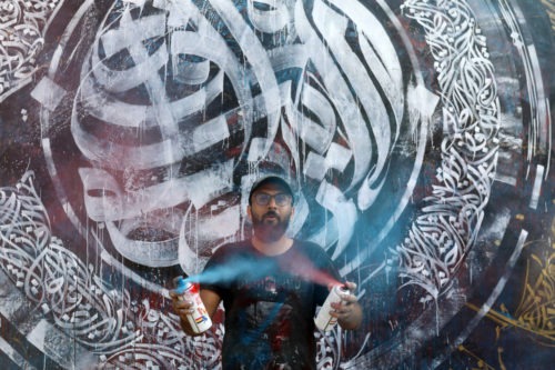 Foto: El artis­ta pales­tino Bilal Kha­led pin­ta un muro en la ciu­dad de Gaza el 1 de julio. Imá­ge­nes de Ash­raf Amra APA