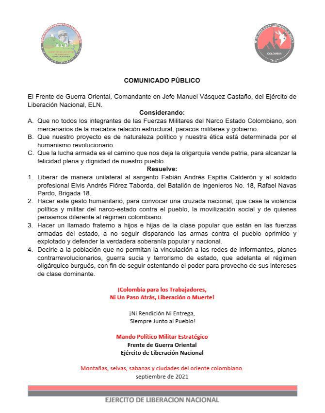 Tras ser secues­tra­dos por el ELN el pasa­do 7 de sep­tiem­bre, el sar­gen­to Fabián Andrés Espi­tia Cal­de­rón y el sol­da­do Elvis Andrés Fló­rez Tabor­da, fue­ron libe­ra­dos hace pocos minu­tos en el pie del mon­te arau­cano. La Defen­so­ría del Pue­blo con­fir­mó la noti­cia a tra­vés de su cuen­ta en Twit­ter, don­de tam­bién se infor­mó de la par­ti­ci­pa­ción de la Igle­sia Cató­li­ca y el Comi­té Inter­na­cio­nal de la Cruz Roja.
