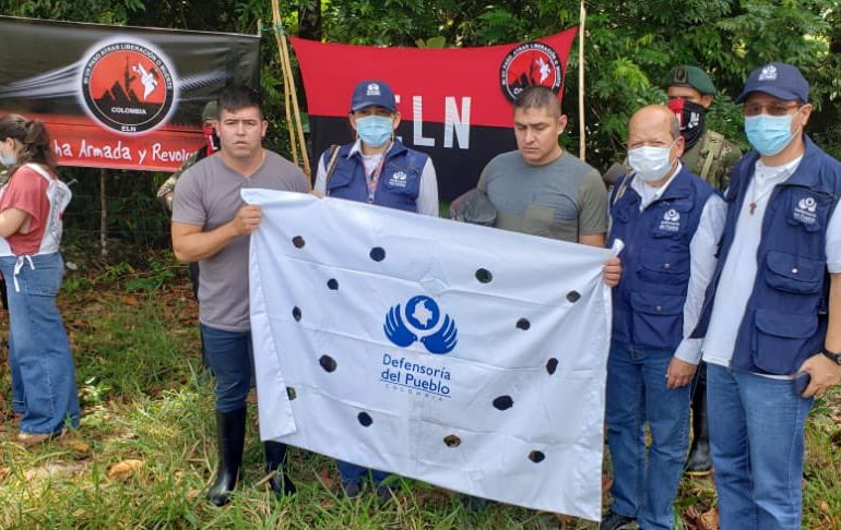 Foto: Secues­tra­dos libe­ra­dos por el ELN. Foto­gra­fía Defen­so­ría del Pueblo.