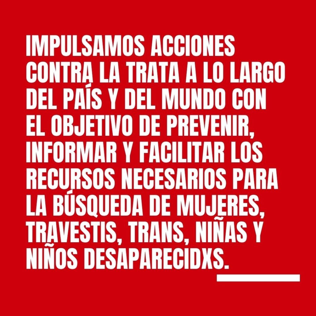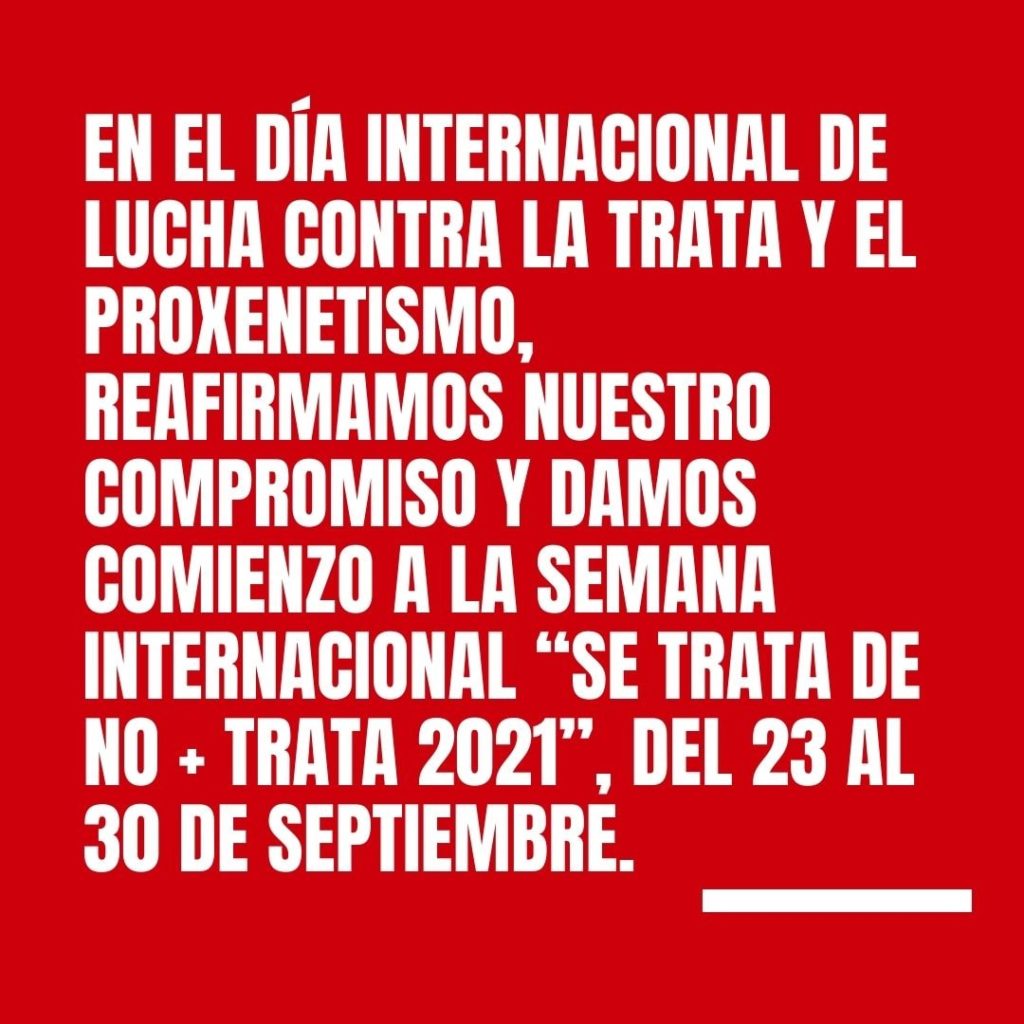 En el día Inter­na­cio­nal de Lucha Con­tra La Tra­ta y El Pro­xe­ne­tis­mo, reafir­ma­mos nues­tro com­pro­mi­so y damos comien­zo a la Sema­na Inter­na­cio­nal “Se tra­ta de NO + TRATA 2021”, del 23 al 30 de sep­tiem­bre. Impul­sa­mos accio­nes con­tra la tra­ta a lo lar­go del país y del mun­do con el obje­ti­vo de pre­ve­nir, infor­mar y faci­li­tar los recur­sos nece­sa­rios para la bús­que­da de muje­res, tra­ves­tis, trans, niñas y niños desaparecidxs.