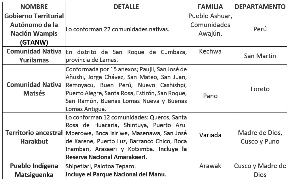 En el caso de los pueblos amazónicos peruanos, son hasta el momento cinco los territorios indígenas que han emprendido el camino de su reconocimiento como TICCA. Estos son: