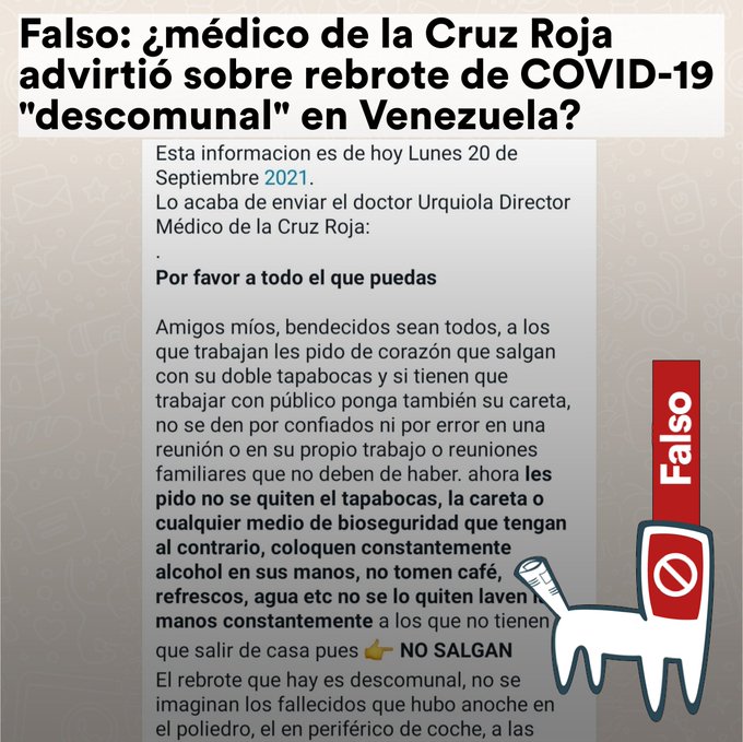 En días recientes se había difundido un mensaje en redes sociales, incluidas las plataformas de WhatsApp y Twitter, atribuido a Alberto Urquiola, director de la Cruz Roja Venezolana, donde se asegura que hay un «rebrote descomunal» de casos de covid-19 en Venezuela y que el número de fallecidos en el Poliedro de Caracas y en otros centros de atención de la ciudad es elevado.