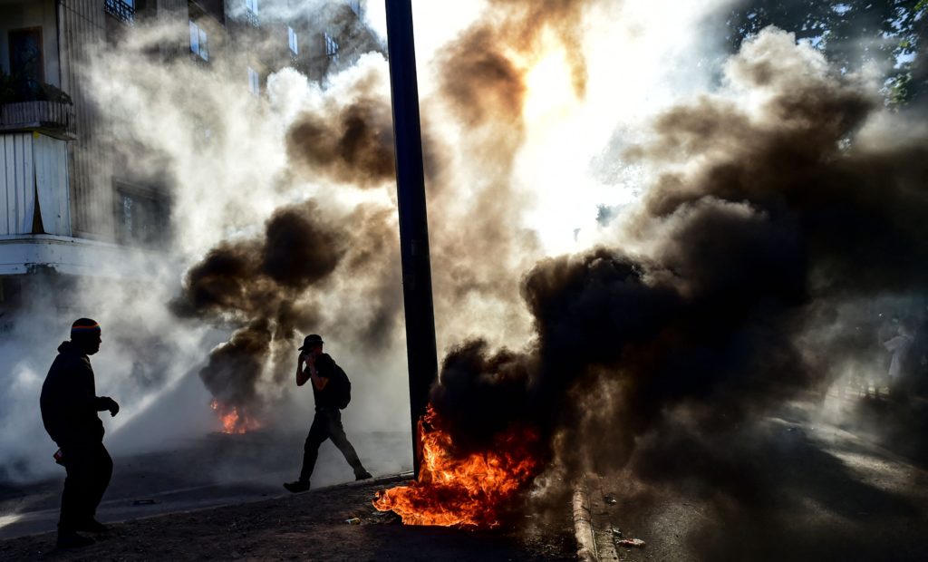 Un manifestante alimenta una barricada de fuego, ayer durante el segundo aniversario del alzamiento contra la desigualdad social en Santiago. Foto Afp