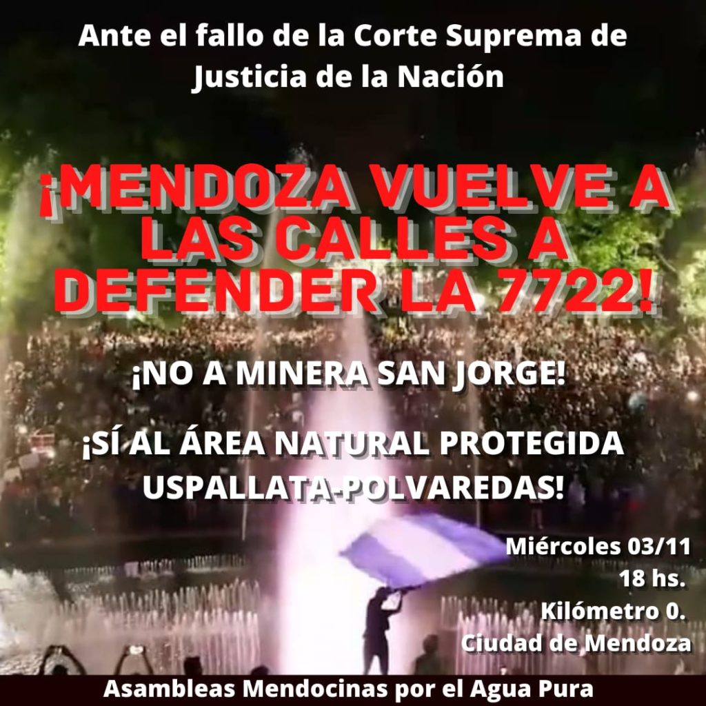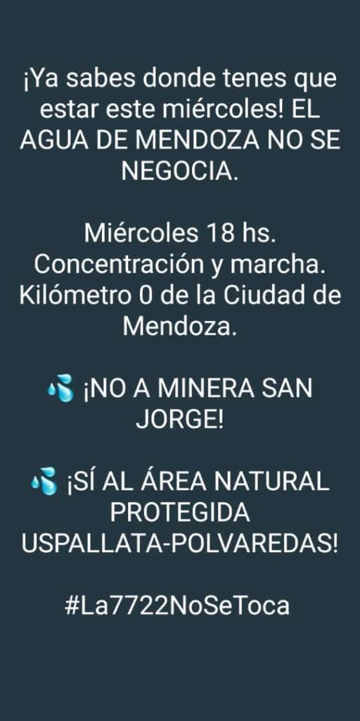 Por estos días, además del rechazo al nuevo fallo de la Corte, la militancia por el agua apunta a la creación del “Área Natural Protegida Uspallata-Polvaredas”. “Este proyecto es la única herramienta probadamente efectiva con que contamos hoy para terminar de manera definitiva con el plan devastador de Minera San Jorge, que amenaza las fuentes de agua de nuestro Valle y de todo el Oasis Norte donde vive la mayor parte de la población de Mendoza”, difundió la Asamblea de Vecinos Autoconvocados de Uspallata.