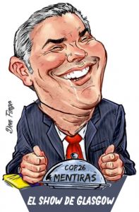 Allá posó de ambientalista, y aquí fumiga los campos con el tóxico glifosato. Poco o nada hace para frenar la deforestación de la Amazonía. No le importa la vida de los ambientalistas. Promueve el fracking. Nada dice frente a la contaminación de las petroleras. Pero a pocos meses de terminar su mandato promete que va a reducir para el 2030 las emisiones de CO2 a la atmósfera en un 51%, y que para el 2050 tendremos la carbono-neutralidad. Que va a proteger áreas marinas y aumentar 100 veces las energías renovables. ¡Qué va!