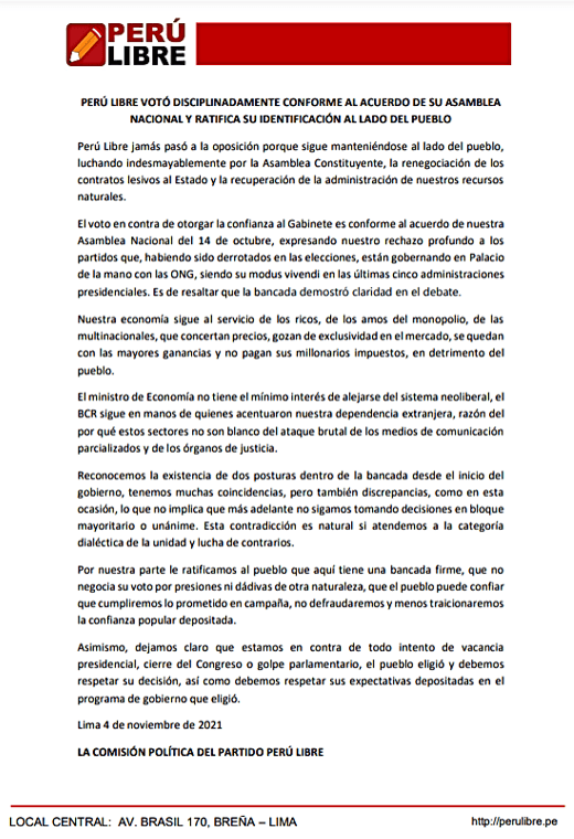 Votaron en contra de dar la confianza María Agüero Gutiérrez, Guido Bellido, Guillermo Bermejo, Waldemar Cerrón, Flavio Cruz Mamani, Alex Flores Ramírez, Américo Gonza Castillo, Segundo Montalvo Castillo y Margot Palacios Huamán.