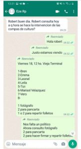 Un día después de las elecciones legislativas de Junio, llegaron notificaciones a dos educadoras comunitarias de la Biblioteca Niños Pájaros, que a su vez habían sido candidatas por la lista 251 en el partido MCP-AJI20. Se ven muy sorprendidas cuando descubren que les habían abierto una causa penal acusándolas de una situación donde no tuvieron nada que ver. Una de ellas era la que tenía el nombre completo en ese mensaje de Whatsapp.