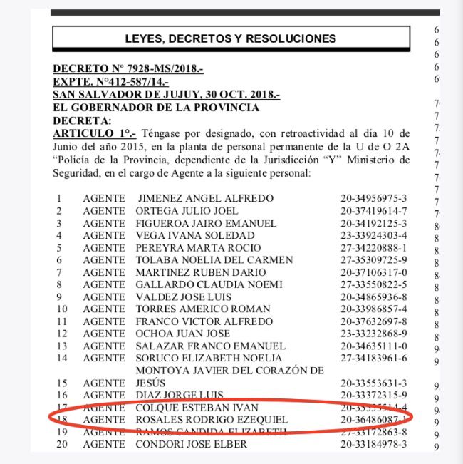 según boletín oficial Nº 18 del día 11 de Febrero de 2019 como miembro de planta de personal permanente de la U de O 2A Policía de la Provincia, dependiente de la Jurisdicción “Y” Ministerio de Seguridad.