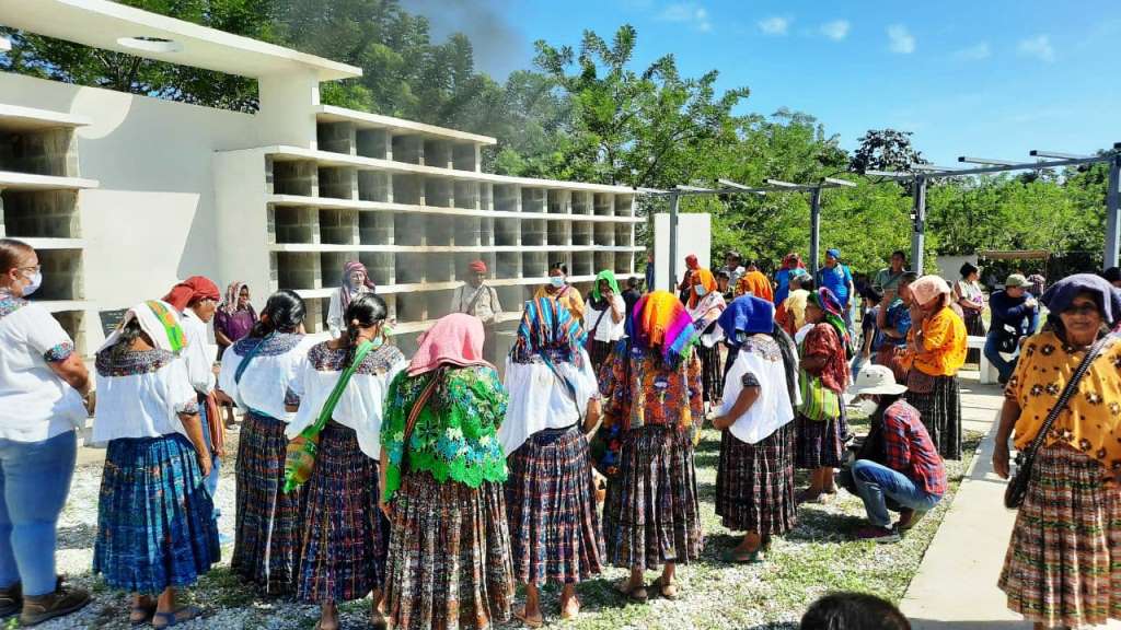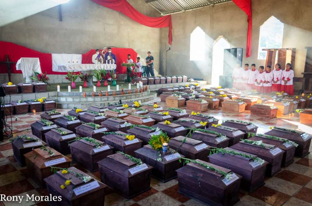 Familiares, autoridades locales y los forenses de la FAFG se encargaron de ordenar las cajas con las osamentas en un mausoleo de siete niveles, por la cantidad de cajas que se inhumaron. Durante la inhumación, familiares intervinieron, compartieron su testimonio y condenaron las brutalidades que vivieron por parte del Estado de Guatemala en los 80 y, que en sus palabras, continua en la actualidad.