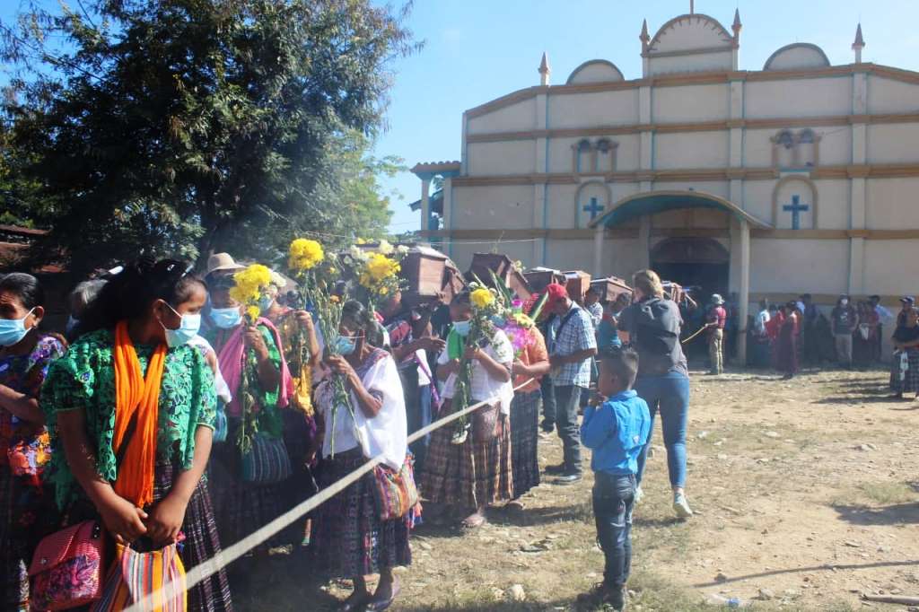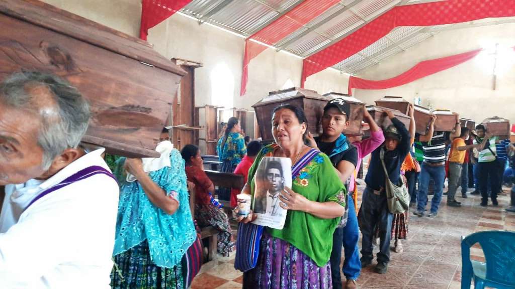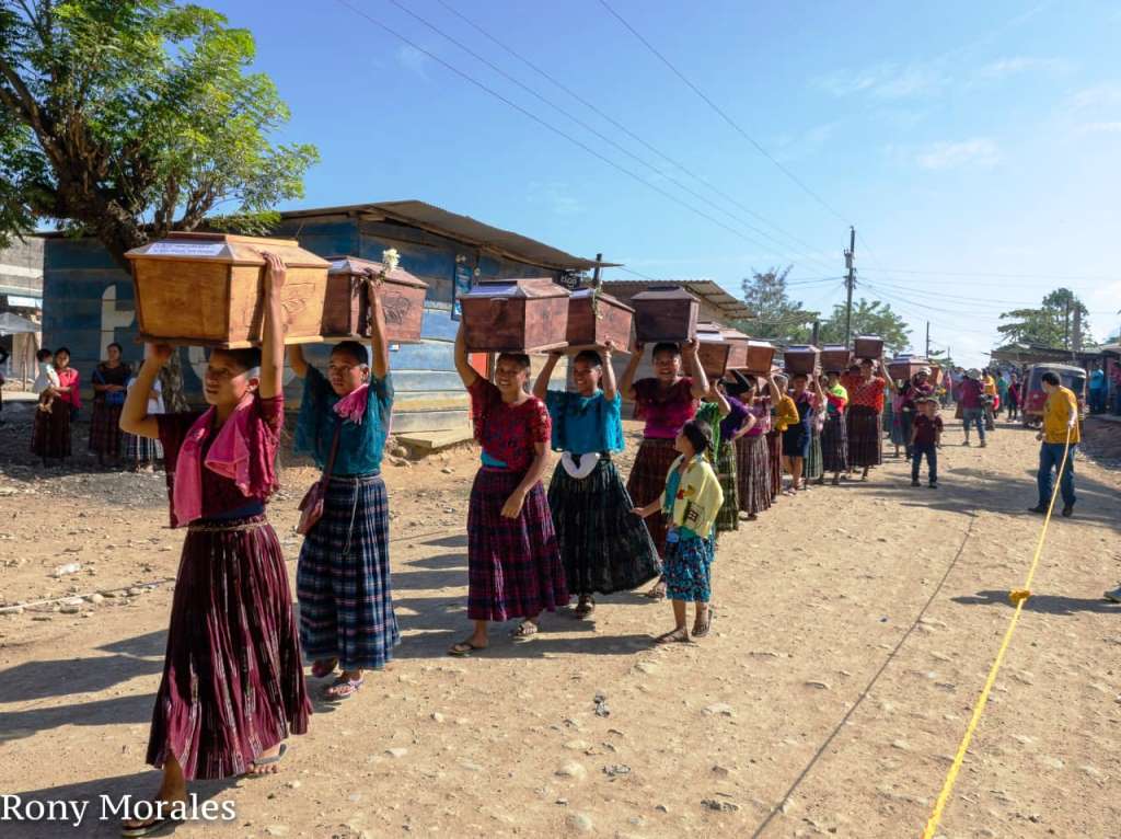 Las cajas con las osamentas empezaron a salir una por una de la iglesia, cargadas en los hombros de hombres y mujeres, adultos y jóvenes, para incorporarse a la caravana que encabezaban las abuelas de Sepur Zarco y que se dirigió hacia el Sitio de la Memoria, construido por las familias para sepultar a las víctimas. Cientos de personas acompañaron durante el recorrido a pie. Entre llanto y consignas avanzó la caravana sobre la calle principal de la aldea.