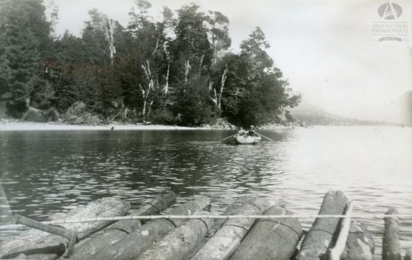 Transporte de rollizos en lago Traful, antes de que se creara Parques.