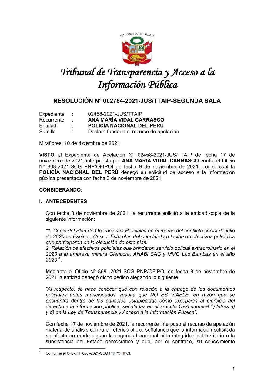 La decisión se adoptó mediante la Resolución 002784 – 2021-JUS/TTAIP-SEGUNDA SALA que declara fundado el recurso de apelación presentado por organizaciones que patrocinan a defensores de derechos humanos en la provincia de Espinar, Cusco.