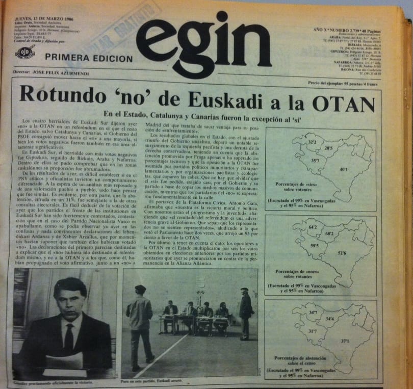 Frente a ello manifestamos la apuesta firme y decidida por la paz, por el respeto a la soberanía de los pueblos y por el fin de las agresiones y guerras imperialistas que originan destrucción y emigraciones masivas. Exigimos la salida inmediata de la OTAN, el cierre definitivo de las bases militares y el compromiso de no injerencia en los asuntos de otros Estados. Por todo ello diversas organizaciones, EH Donbass Elkartasun Komitea, Boltxe, Euskal Komunisten Batasuna (EKB), EHPK-PCPE, la Plataforma OTAN EZ, Ezker Anitza-IU, Siriaren Alde y Ezkerretik Foroa, convocamos una concentración de denuncia el sábado 12 de marzo, 36 aniversario del rechazo de Euskal Herria a la OTAN en el Referendum, a las 12,30 en el Arriaga de Bilbao, a la que pedimos el apoyo más amplio y decidido.