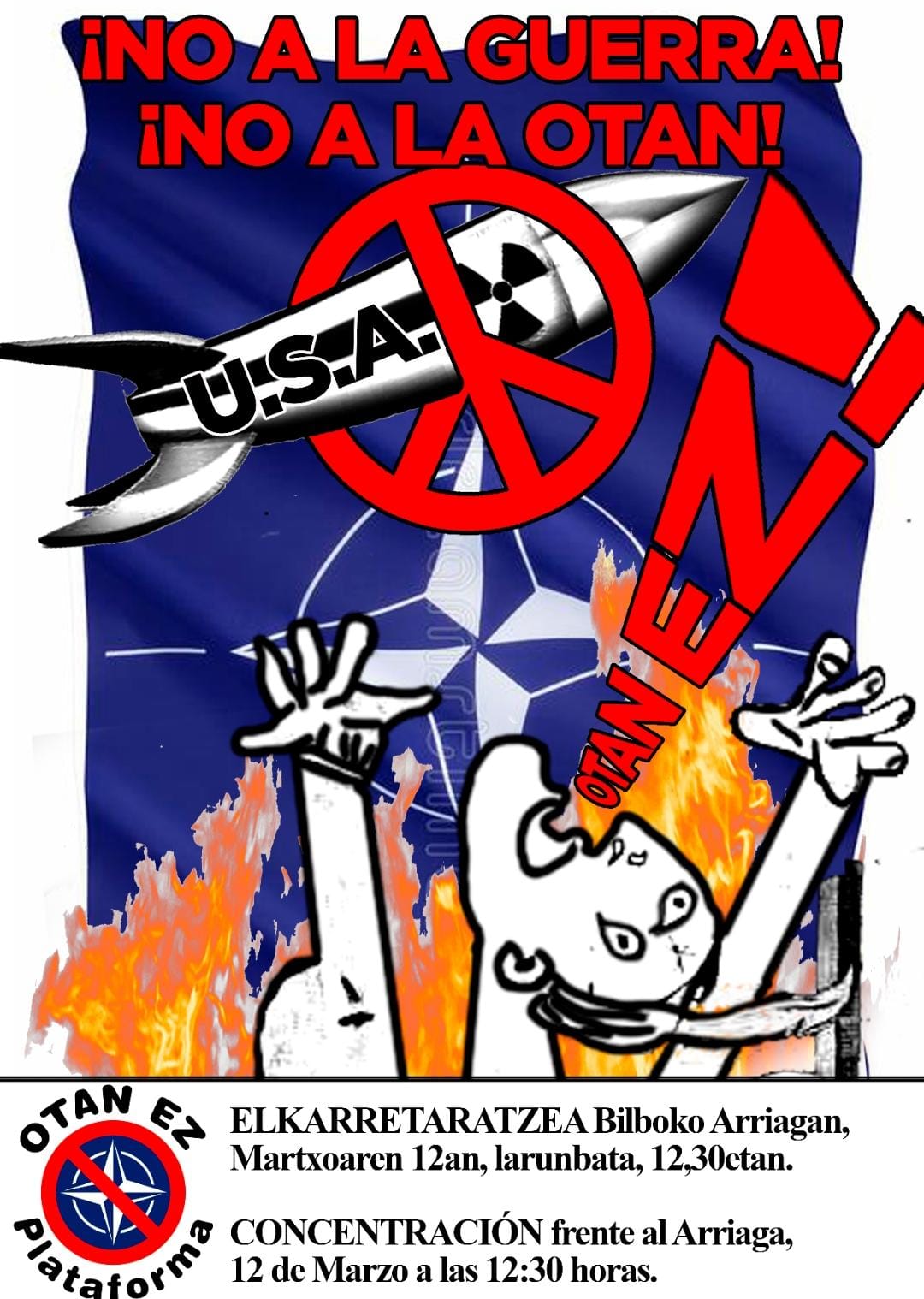 Frente a ello manifestamos la apuesta firme y decidida por la paz, por el respeto a la soberanía de los pueblos y por el fin de las agresiones y guerras imperialistas que originan destrucción y emigraciones masivas. Exigimos la salida inmediata de la OTAN, el cierre definitivo de las bases militares y el compromiso de no injerencia en los asuntos de otros Estados. Por todo ello diversas organizaciones, EH Donbass Elkartasun Komitea, Boltxe, Euskal Komunisten Batasuna (EKB), EHPK-PCPE, la Plataforma OTAN EZ, Ezker Anitza-IU, Siriaren Alde y Ezkerretik Foroa, convocamos una concentración de denuncia el sábado 12 de marzo, 36 aniversario del rechazo de Euskal Herria a la OTAN en el Referendum, a las 12,30 en el Arriaga de Bilbao, a la que pedimos el apoyo más amplio y decidido.