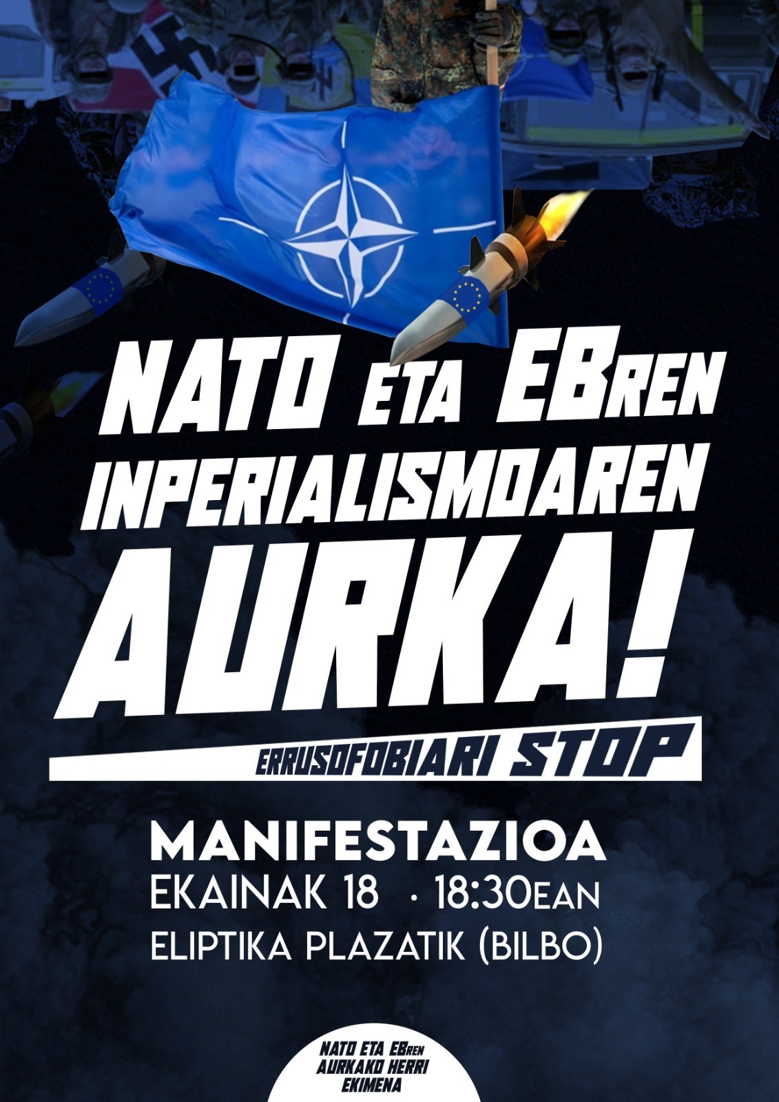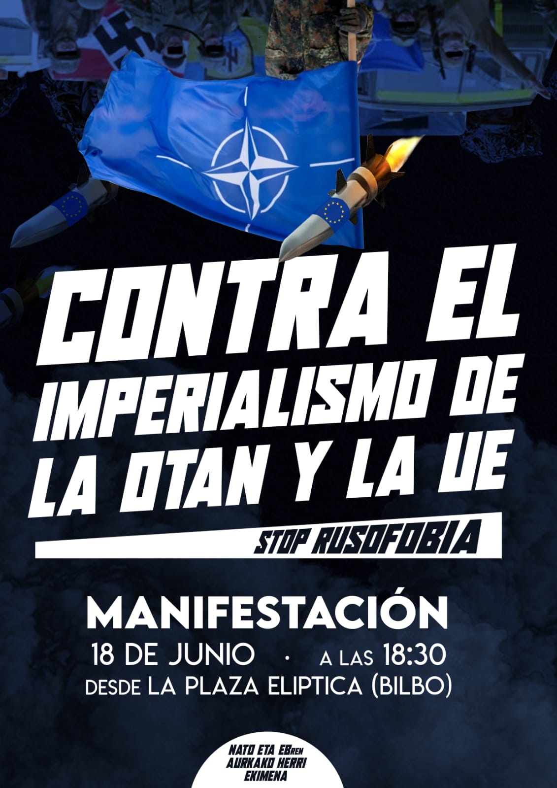 Hori guztia esanda, Euskal Herriko zein beste nazio batzuetako herri eta auzo guztiei dei egiten diegu inperialismoaren, kapitalismoaren eta faxismoaren aurkako borroka antolatzeko. Era berean, NATOren eta EBren eraso inperialistaren aurka dauden pertsona guztiak Bilbon, ekainaren 18an, 18:30etan plaza Eliptikotik aterako den manifestazioan parte hartzera gonbidatzen ditugu.