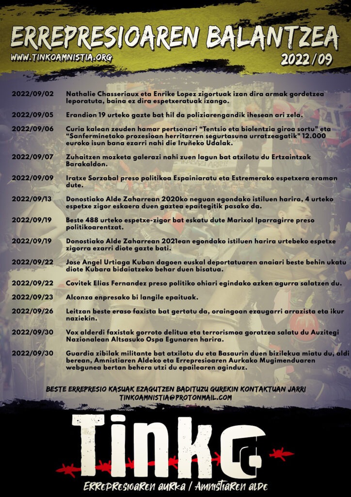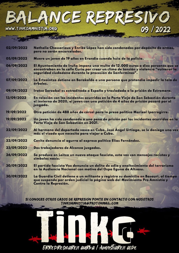 2022/09/02 Nathalie Chasseriaux eta Enrike Lopez zigortuak izan dira armak gordetzea leporatuta, baina ez dira espetxeratuak izango. 2022/09/05 Erandion 19 urteko gazte bat hil da poliziarengandik ihesean ari zela. 2022/09/06 Curia kalean zeuden hamar pertsonari “Tentsio eta biolentzia giroa sortu” eta “Sanferminetako prozesioan herritarren segurtasuna urratzeagatik” 12.000 euroko isun bana ezarri nahi die Iruñeko Udalak. 2022/09/07 […]