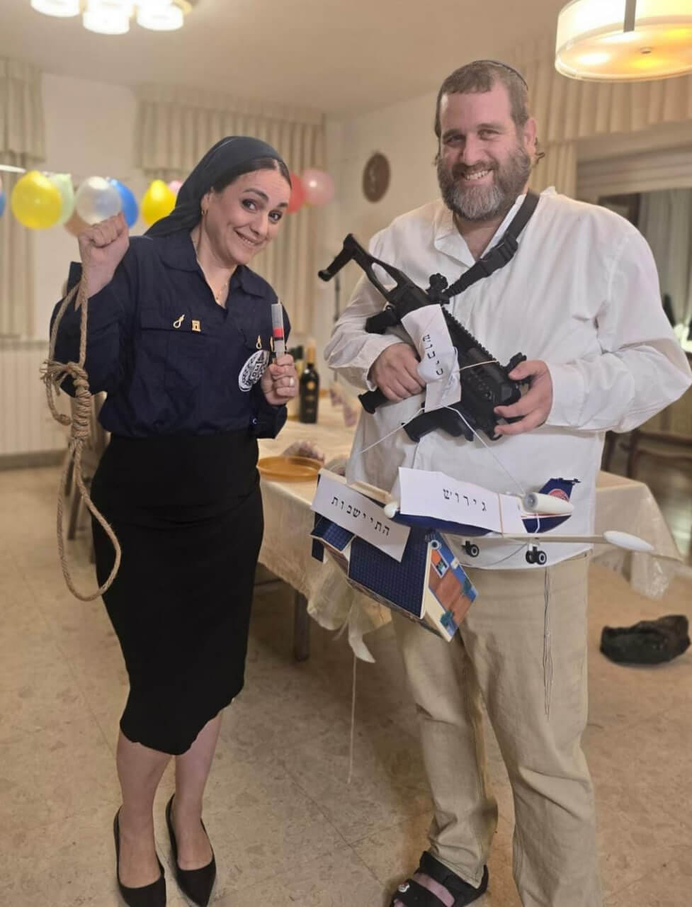 A su lado, vestido con una camisa blanca, se encontraba su marido, Yehuda, cargando un rifle automático con una etiqueta que dice «ocupación», un avión en miniatura con una etiqueta que dice «expulsión» y una casa en miniatura con una etiqueta que dice «colonización».
