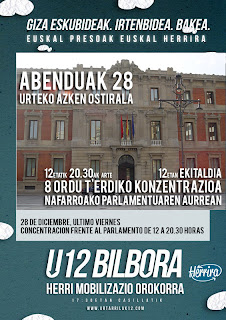 El día 28, último viernes del mes y del año, se realizarán movilizaciones por los derechos de los presos en decenas de localidades navarras. En Iruñea, Herrira llama a una encartelada de ocho horas y media frente al Parlamento de Navarra, de 12 del mediodía a 8.30 de la tarde. El acto central se realizará a las 12 del mediodía, y en él se hará un llamamiento a tomar parte en la Movilización General Popular del 12 de enero.