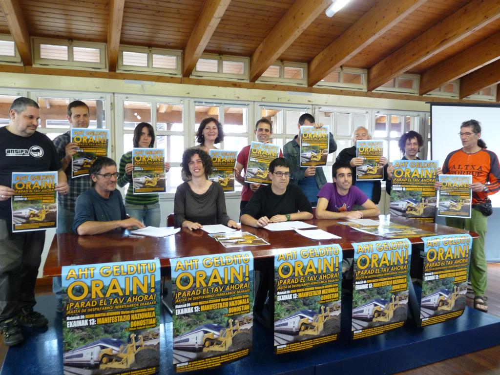 Euskal Herriko hainbat mugimenduk, sindikatuk eta erakunde sozialek AHT gelditzea exijitzeko baterako kanpaina egingo dute. Ekimen bateratu honen aurkezpen gisa, gaurko prentsaurrekoan “AHT GELDITU ORAIN! Xahuketa gehiago ez! Herritarrok erabaki!” goiburua duen manifestua argitara eman dugu. AHT gelditzearen aldeko manifestu horren inguruan atxikimendu ugari biltzeko asmoa dugu, eta informazio eta mobilizazio dinamika bat garatuko da, ekimenaren buruan AHT gelditzea exijitzeko manifestazioa deituko dugularik ekainaren 13an Donostian. Hori dela eta, AHTren oposizioarekin bat egiten duten mugimendu, pertsona eta erakunde guztiei dei egiten diegu baterako ekimen honek parte-hartze ahalik eta zabalena eta irekiena izan dezan.