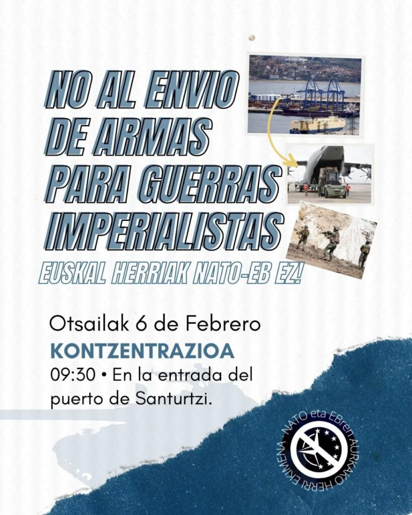 Herri ekimenak deituta otsilaren 6an kontzentrazioa burutuko da Santurtziko portuan guda inperialistetarako armak bidaltzearen aurka. Zabaldu deialdia eta parte hartu!!