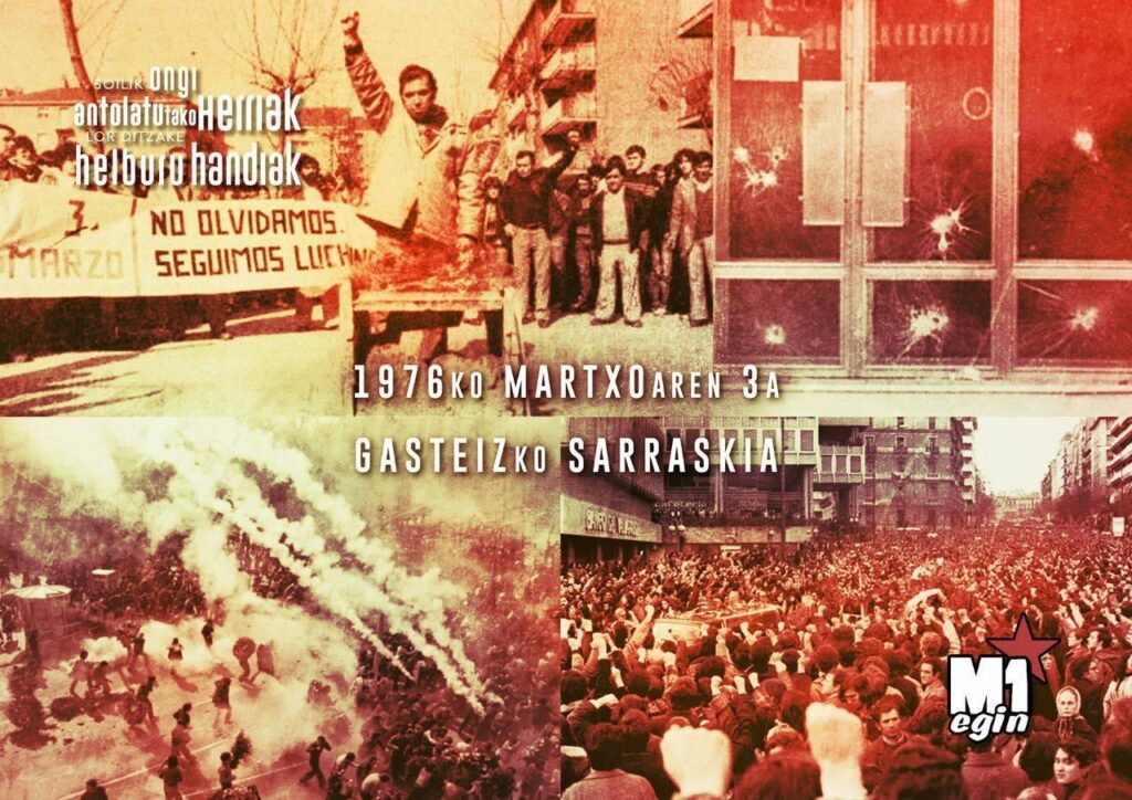1976ko martxoaren 3an polizia armatu espainolak 5 langile hil zituen Gasteizen greba orokorraren testuinguruan. 1976ko urtarrilaren 9an 6.000 langile inguruk haien lan-egoera hobetzeko greba hasi zuten. Forjas Alavesas enpresan sortu zen protesta, baina denborak aurrera egin ahala, Gasteiz osoko enpresetara zabaldu zen. Martxoaren 3an, hirugarren greba orokorrera deitu zuten. Aurreko greba orokorretan ez bezala erabateko jarraipena izan […]