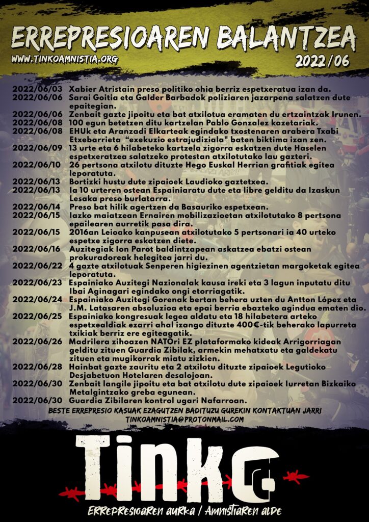 2022/06/03 Xabier Atristain preso politiko ohia berriz espetxeratua izan da. 2022/06/06 Sarai Goitia eta Galder Barbadok poliziaren jazarpena salatzen dute epaitegian. 2022/06/06 Zenbait gazte jipoitu eta bat atxilotua eramaten du ertzaintzak Irunen. 2022/06/08 100 egun betetzen ditu kartzelan Pablo Gonzalez kazetariak. 2022/06/08 EHUk eta Aranzadi Elkarteak egindako txostenaren arabera Txabi Etxebarrieta “exekuzio estrajudiziala” baten biktima izan zen. 2022/06/09 13 urte eta 6 hilabeteko kartzela zigorra […]