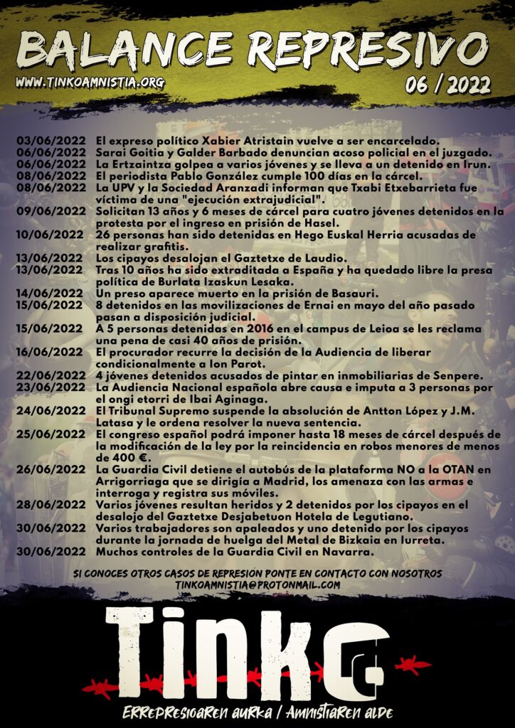 03/06/2022 El expreso político Xabier Atristain vuelve a ser encarcelado. 06/06/2022 Sarai Goitia y Galder Barbado denuncian acoso policial en el juzgado. 06/06/2022 La Ertzaintza golpea a varios jóvenes y se lleva a un detenido en Irun. 08/06/2022 El periodista Pablo González cumple 100 días en la cárcel. 08/06/2022 La UPV y la Sociedad Aranzadi informan que Txabi Etxebarrieta fue víctima de […]