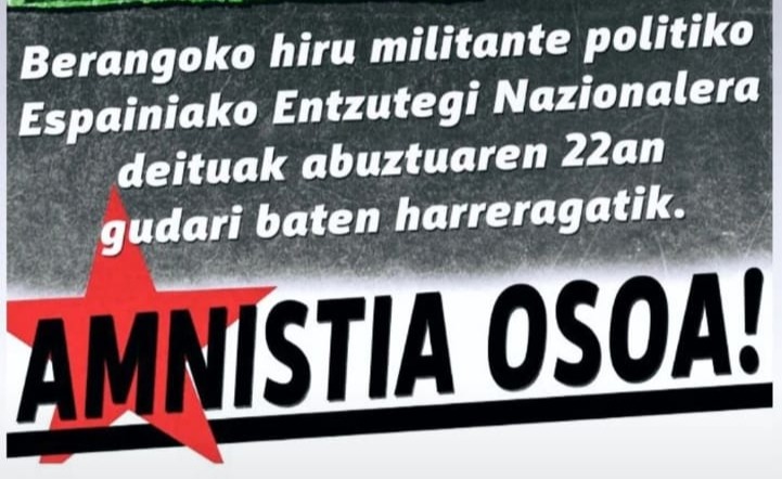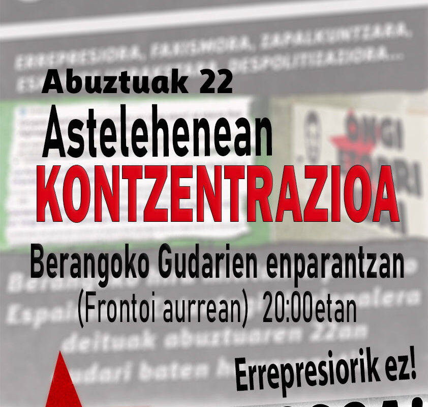 Berangoko hiru militante politiko Auzitegi Nazionalera deitu dituzte, abuztuaren 22an, ongi etorri bat antolatzeagatik. Espainiako Estatuak, beste behin ere, errepresioa erabiltzen du borroka iraultzailearen aurrerapena geldiarazteko eta herri honek dena eman duten militante politiko kontsekuenteenei dien miresmena ezkutatzen saiatzeko. Dena eman duten militanteei buruz ari gara, Estatuaren kartzela politikaren eta Euskal Herriko herri langileak jasaten […]