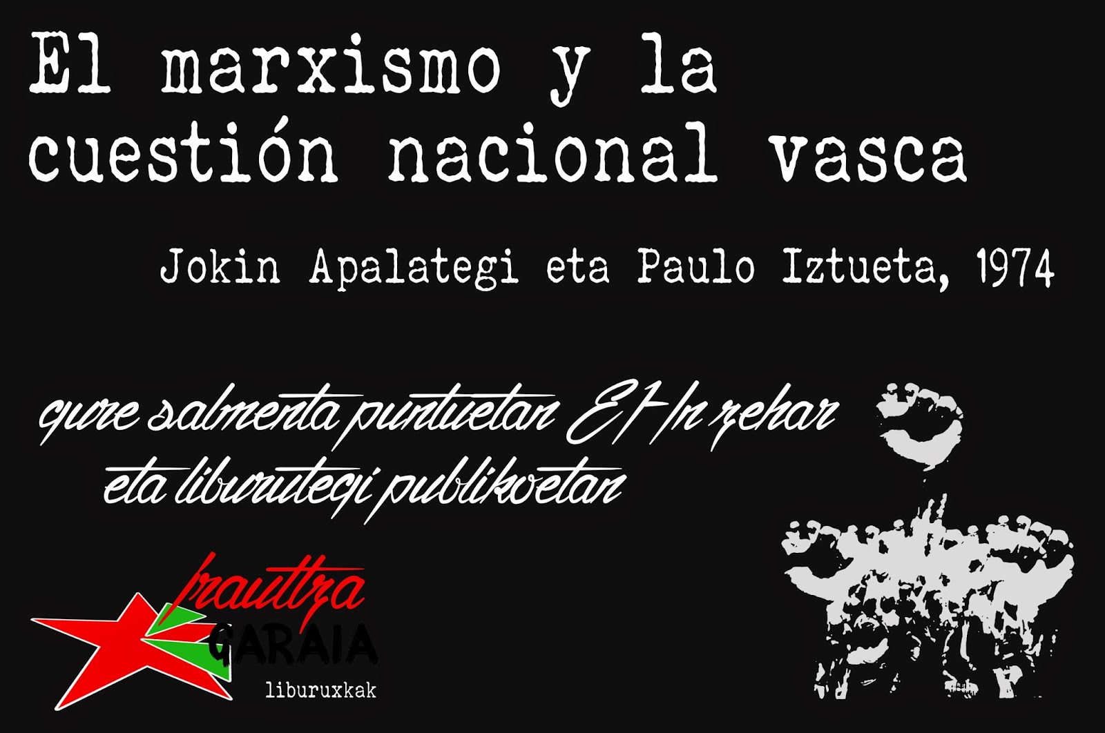 Jokin Apalategiren eskuzabaltasunez, Paulo Iztuetarekin batera idatzitako »El marxismo y la cuestión nacional vasca» liburuaren ehunka ale jaso ditugu. IRAULTZA GARAIA ekimenak gogotsu zabalduko du Euskal Herrian zehar liburutegi publikoetan, dokumentazio zentruetan zein gure salmenta puntuetan euskal lan teoriko iraultzaileen artean klasiko bat dena, berriro Euskal Herri Langileak eskuragarri izan dezan.