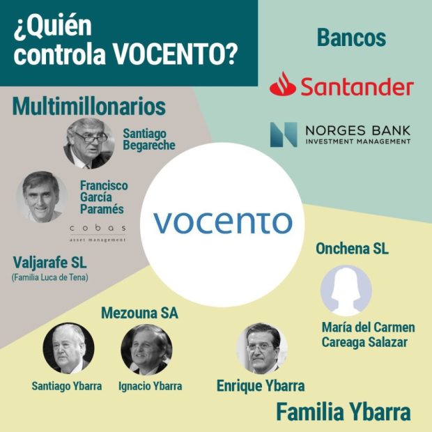 La fami­lia Yba­rra es la que, pre­ci­sa­men­te, se sitúa a la cabe­za del accio­na­ria­do de Vocen­to en la actua­li­dad. A tra­vés de la socie­dad Mezou­na S.A con­tro­la el 11’07% del gru­po. A ello hay que sumar el 6,5% que posee Enri­que Yba­rra y el 5,4% que está en manos de Onche­na S.L., una con­sul­to­ra de inver­sio­nes pre­si­di­da por María del Car­men Carea­ga Sala­zar. Sala­zar es mar­que­sa de Arri­lu­ce de Yba­rra, hija de Fer­nan­do de Yba­rra López Dóri­ga –a su vez, pri­mo del ya men­cio­na­do Emi­lio Yba­rra– y una de las muje­res más ricas de nues­tro país, gra­cias a sus nego­cios en Más­Mó­vil, Iber­pa­pel, Duro Fel­gue­ra, la sicav Carfy y el pro­pio Vocen­to, entre otras sociedades.