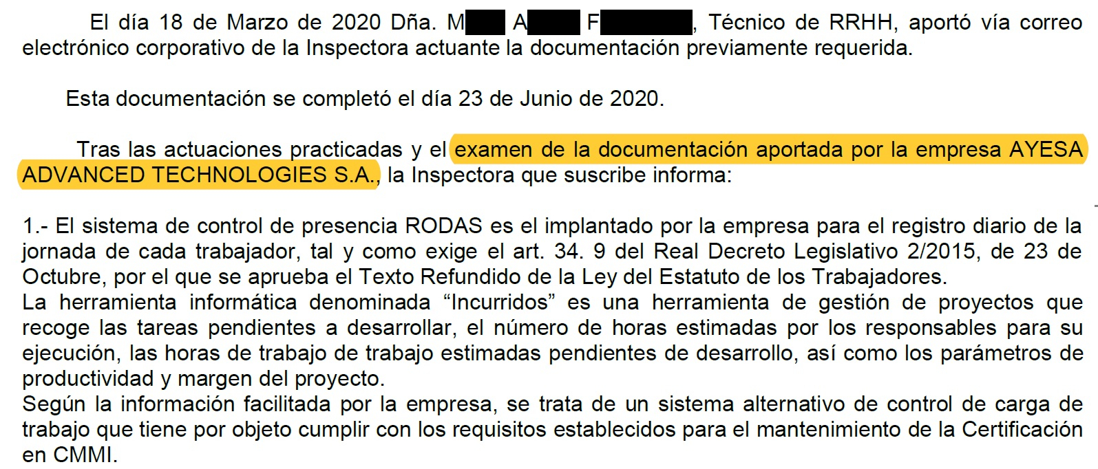 1.- Que AYESA AT tiene una doble contabilidad de las horas realizadas por los trabajadores/as. El sistema que supuestamente contabiliza las horas realizadas, y que es el que la Empresa muestra ante la Inspección de Trabajo y los juicios, pero que no contabiliza las horas reales que realizan los trabajadores. Este sistema se compone del RODAS (que supuestamente registra las entradas y salidas de los trabajadores y que debiera ser el que realmente mostrase las horas de trabajo efectivo de cada trabajador) y la hoja de trabajo, en la que solo se permite registrar las horas teóricas, muy lejanas de las horas reales. Sin embargo, la contabilización de las horas reales los Jefes de Proyecto la hacen en una aplicación denominada INCURRIDOS. De todo esto entregamos pruebas a la Inspección de Trabajo.
