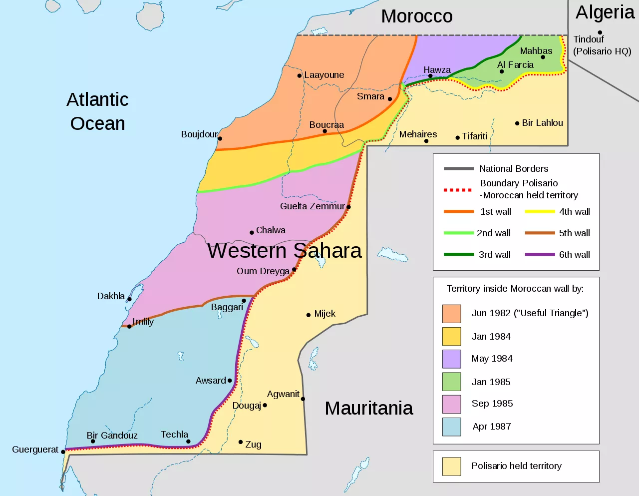 Cuatro años después, Nouakchott firmó un tratado de paz reconociendo la recién declarada República Árabe Saharaui Democrática (RASD) y retirándose de la mitad sur del Sáhara Occidental. Pero Marruecos se mantuvo firme y durante los siguientes 12 años se enfrentó al Frente Polisario. Rabat acordonó progresivamente las zonas urbanas y las zonas ricas en recursos del país con muros de arena, lo que obligó a los saharauis huir hacia el este hacia el desierto, pero no logró derrotar al Polisario en la batalla.