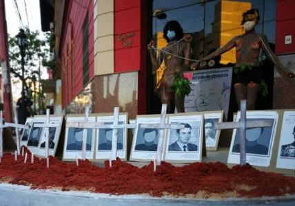 **Imagen de inicio: Instalación frente a local del Partido Colorado /Marcha de los DDHH del 10 de diciembre del 2020 por la recuperación de tierras malhabidas y el juicio y castigo a criminales represores /Fotog. de Adelante!.