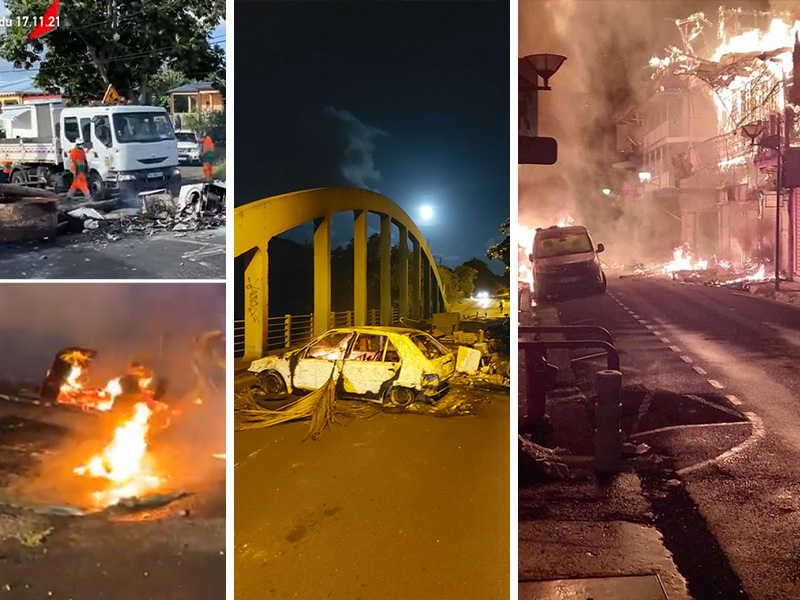 Al blo­queo des­de hace cua­tro días de las carre­te­ras de acce­so al hos­pi­tal uni­ver­si­ta­rio de la capi­tal Poin­te à Pitre, se han aña­di­do dis­tur­bios por las noches. Las mani­fes­ta­cio­nes de pro­tes­ta se han tras­for­ma­do en enfren­ta­mien­tos por las calles entre los tra­ba­ja­do­res y la poli­cía anti­dis­tur­bios, con incen­dios de vehícu­los y edi­fi­cios, saqueos de comer­cios, con cua­tro joye­rías com­ple­ta­men­te des­va­li­ja­das, dis­pa­ros y lan­za­mien­tos de mor­te­ro y áci­do con­tra la policía.