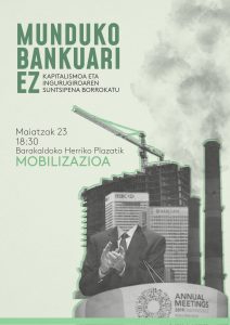 El Banco Mundial y su «imperialismo ecológico» no solo busca, por tanto, reunirse para multiplicar la explotación de la naturaleza, sino también busca otros dos objetivos: por un lado, intentar demostrar que lo hace en un pueblo caracterizado por su conciencia socionatural y antiimperialista, pueblo trabajador supuestamente «pacificado». La burguesía vasca y el Estado español han hecho grandes esfuerzos para lograr que el evento se hiciera en Euskal Herria porque necesitan debilitar, lo más posible, la honda raíz socionatural que alimenta la cultura popular vasca e imponer la irracionalidad consumista y desarrollista. Y por otro, reforzar la ideología cosmopolita, ese falso universalismo inherente al ecologismo burgués: se trata de aumentar las alienaciones múltiples para debilitar la conciencia nacional de clase del proletariado, junto al reforzamiento del nacionalismo español, a la persecución del euskara, de las represiones de toda índole…