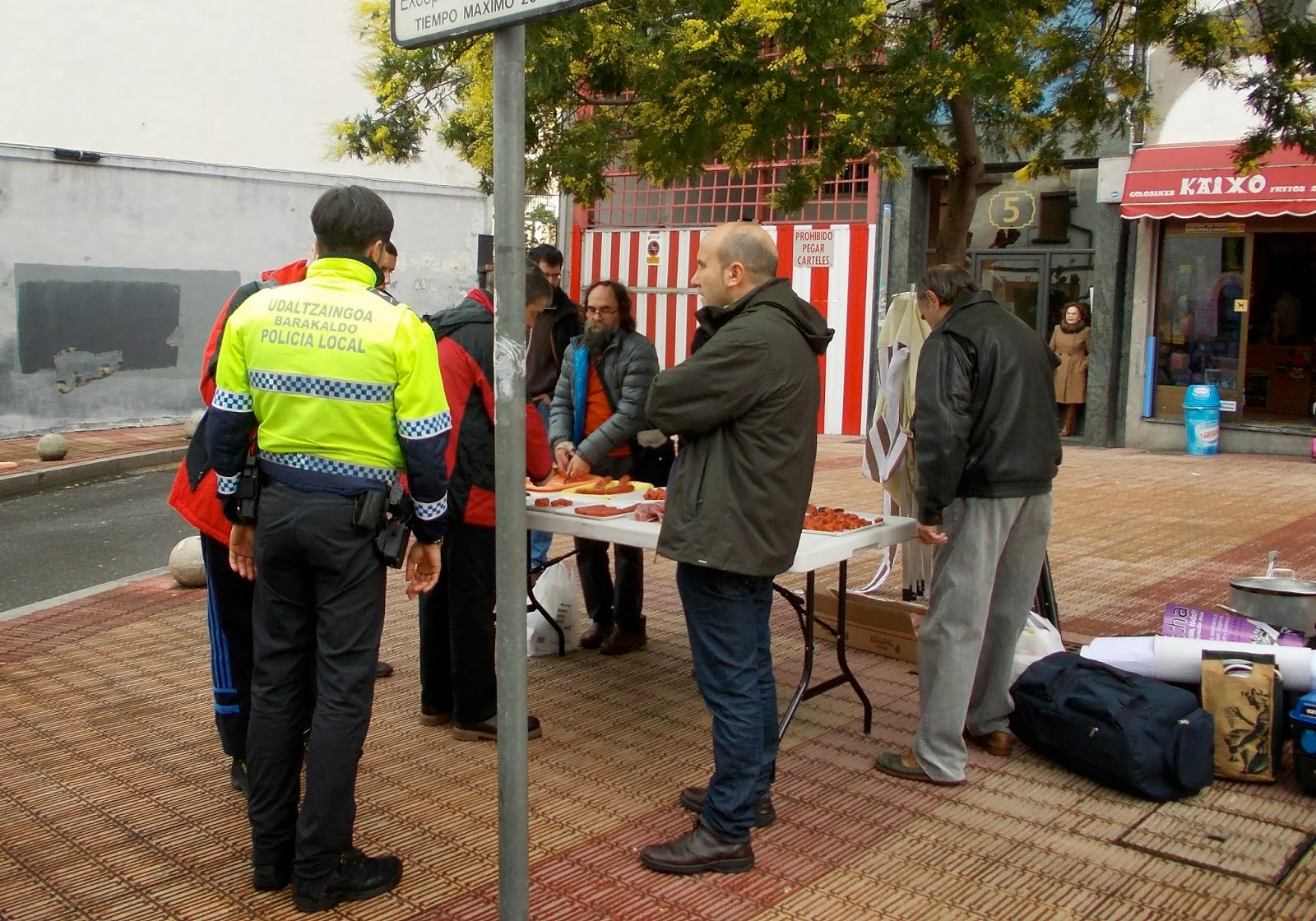Tres patrullas de la Policía Municipal de Barakaldo se han desplazado hasta el barrio de San Vicente, que estaba celebrando sus fiestas, para comunicar a la plataforma contra la exclusión social Berri-Otxoak que no pueden celebrar la chorizada popular contra las retribuciones del equipo de gobierno y los recortes sociales.